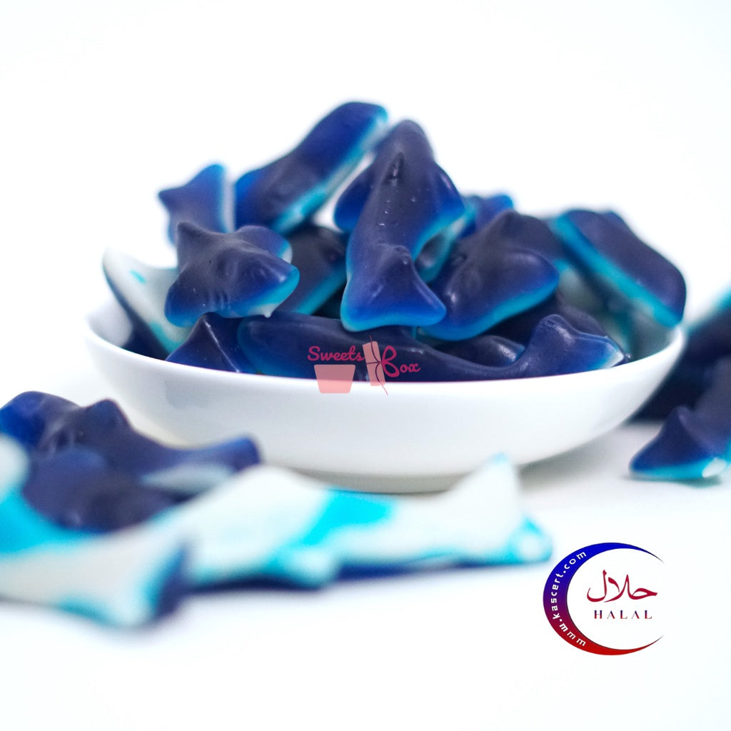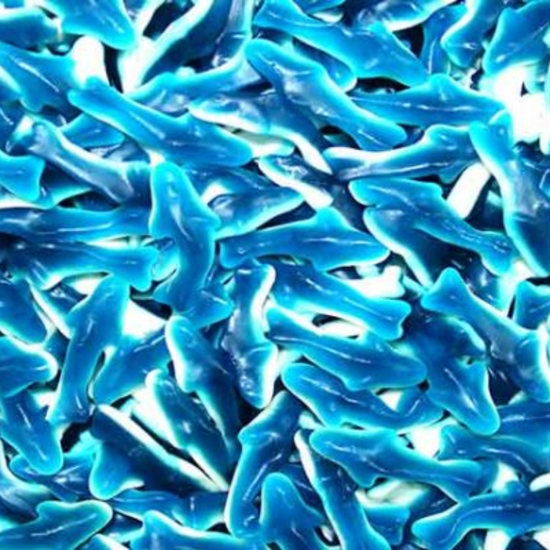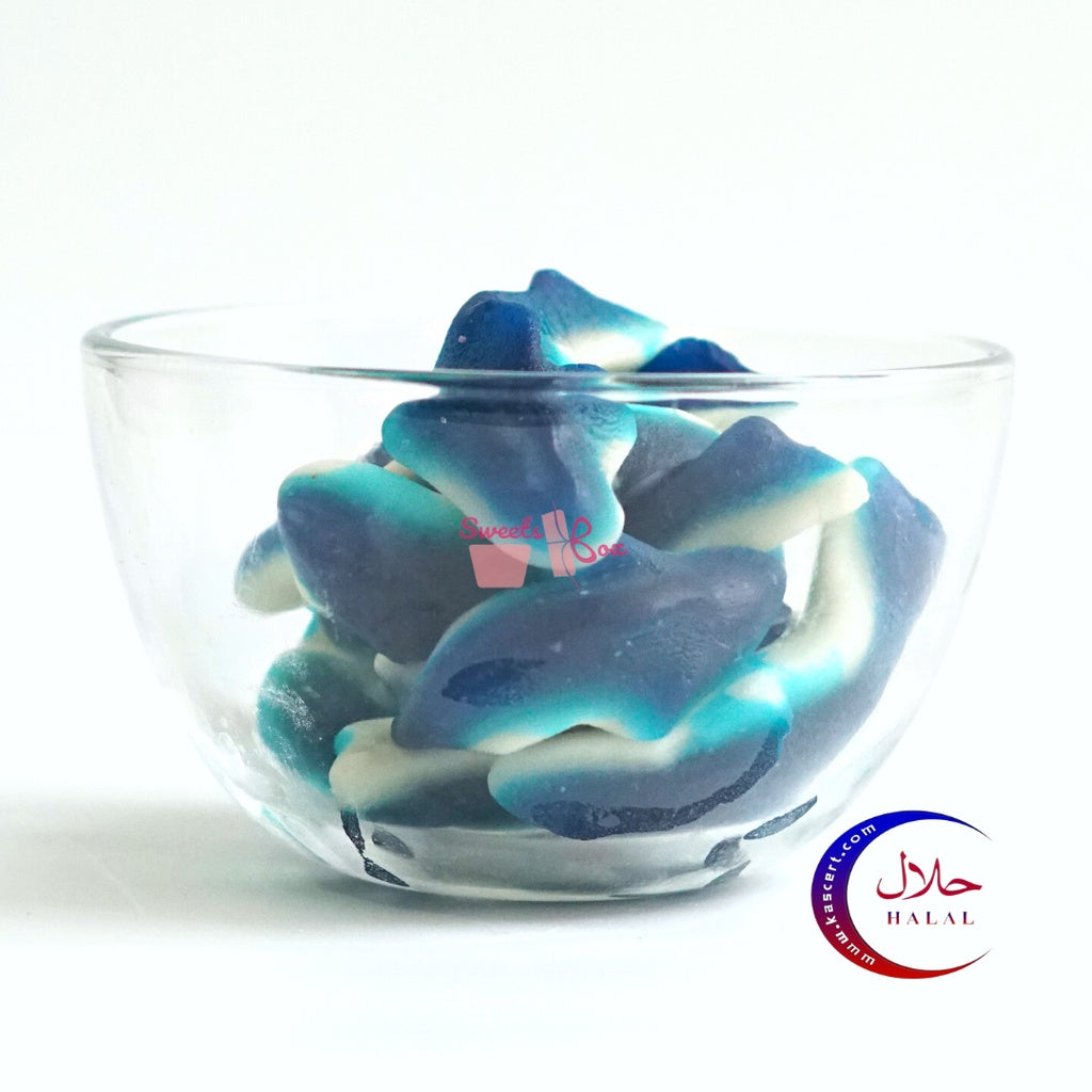- Blue shark-shaped fruity gummies with blueberry flavor