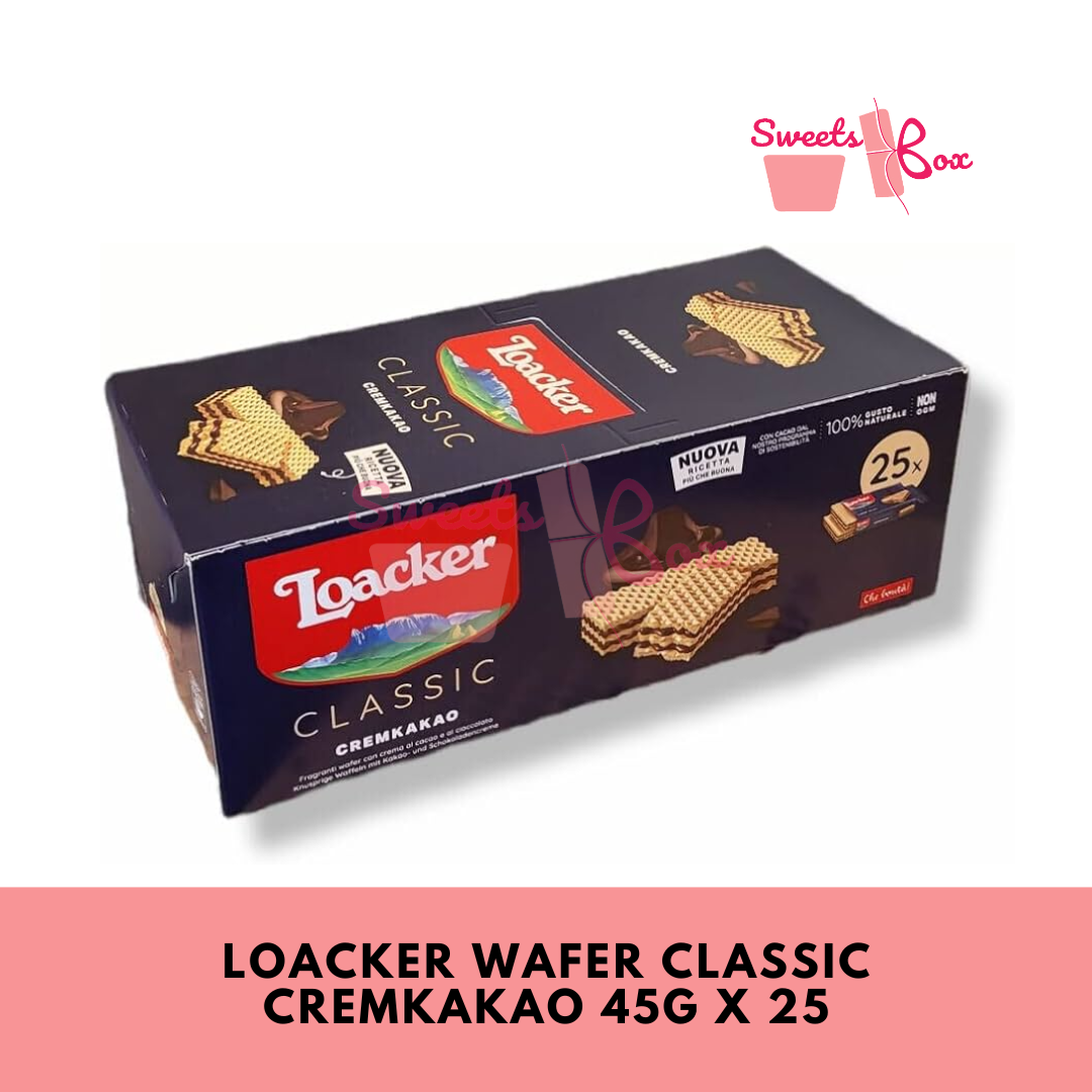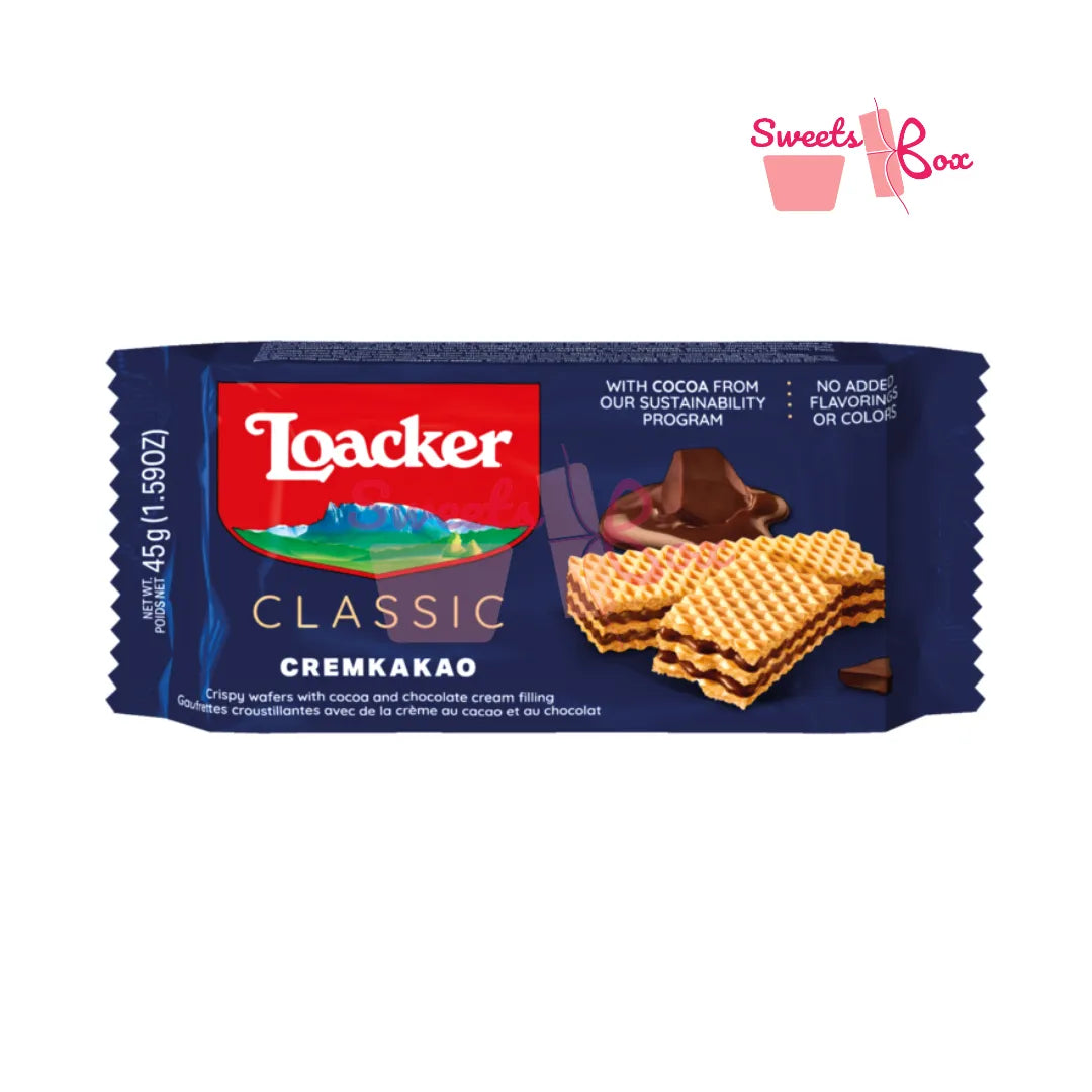 Indulge in the rich chocolate taste of Loacker Classic Cremkakao Wafer 45g. Crafted in Italy, this delightful treat features light, crispy wafers layered with a smooth cream filling made from a special blend of cocoa and chocolate. Every bite delivers a perfect balance of crunch and creaminess, making it a timeless favorite for chocolate lovers of all ages.