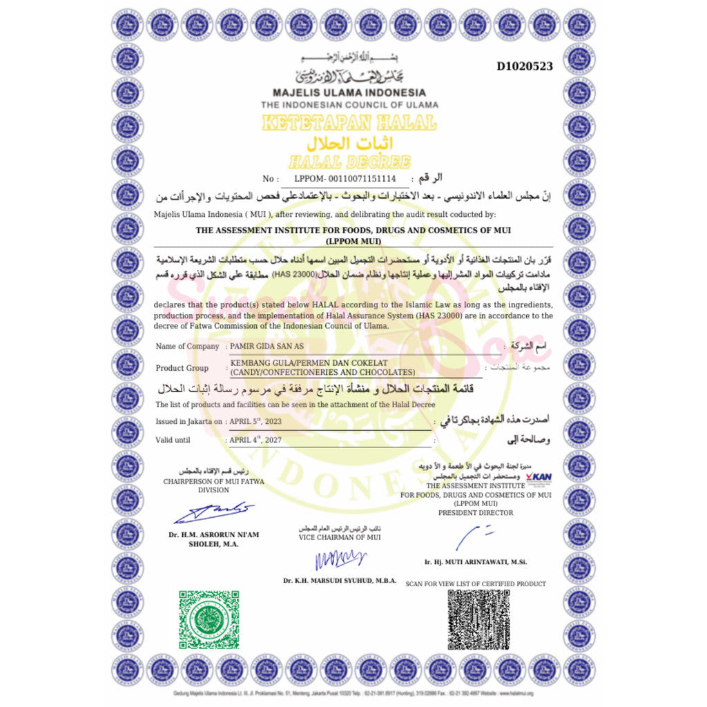 Ref Number : LPPOM-00110071151114Validity Date : 05.04.2023 until 04.04.2027Halal by MUI , Turkey, recognized by JAKIM.