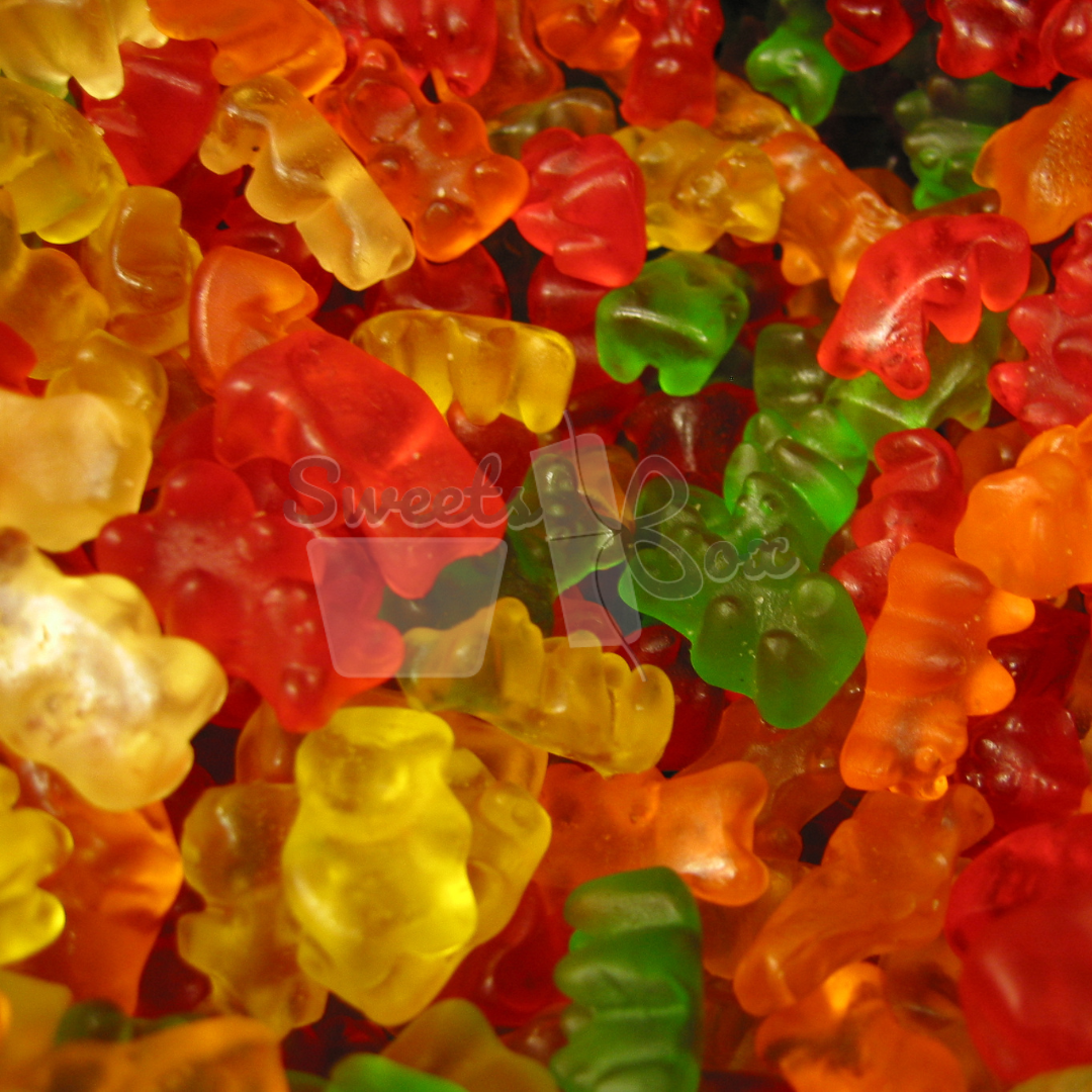Glossy, fruity bear-shaped gummies