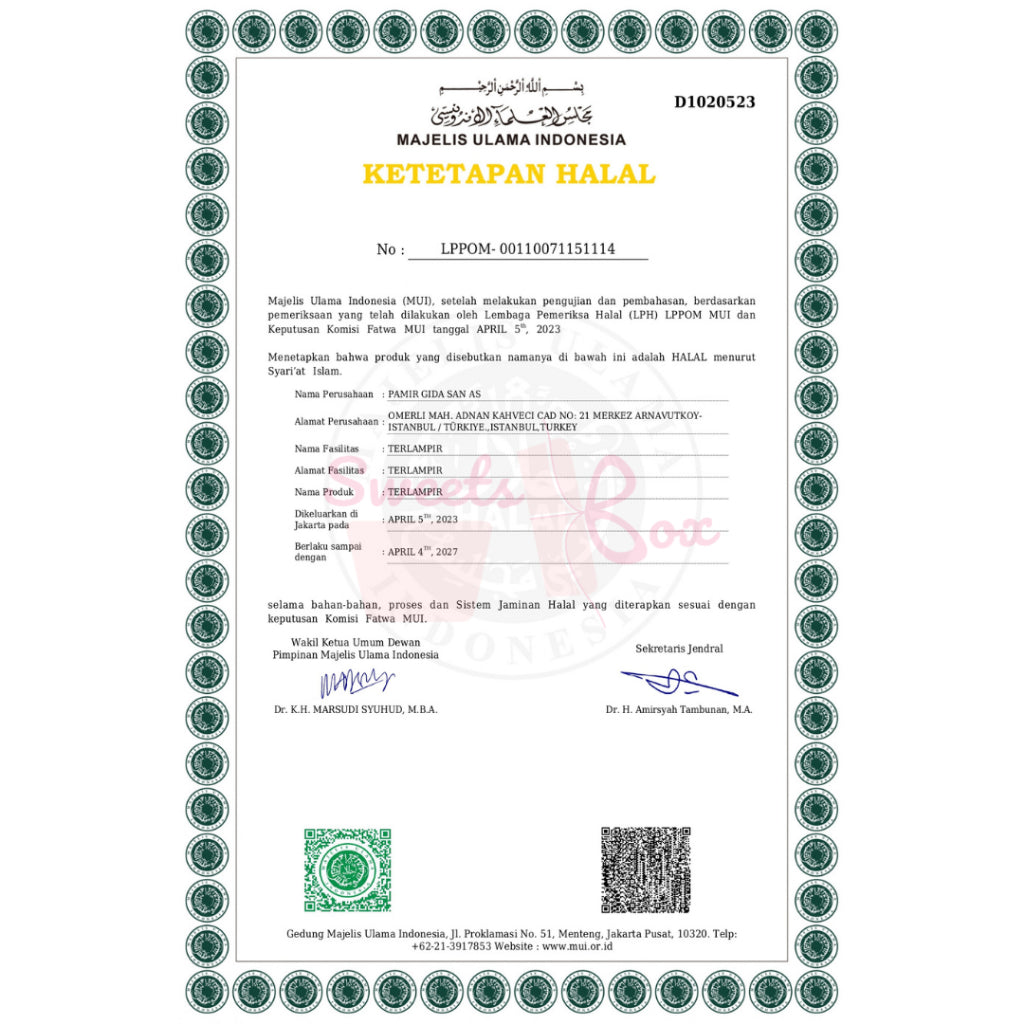 Certified Halal by KAS, Turkey, and MUI (Majelis Ulama Indonesia) recognized by JAKIM.
