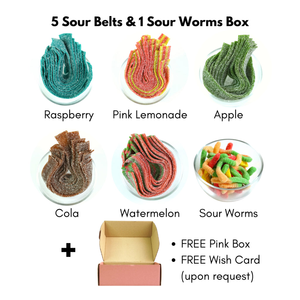 - Combo 5 x 100g repacks Bebeto Sour Belt Blast (5 different flavors) & 1 x 100g repack Sour Worms