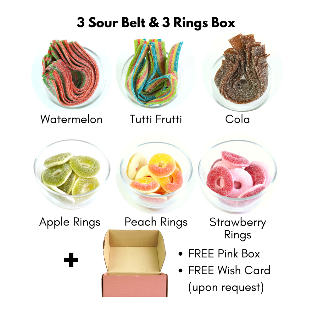 - Combo 3 x 100g repacks Bebeto Sour Belt Blast Watermelon, Cola and Tutti Frutti & 3 x 100g repacks Haribo Apple Rings, Peach Rings & Strawberry Rings